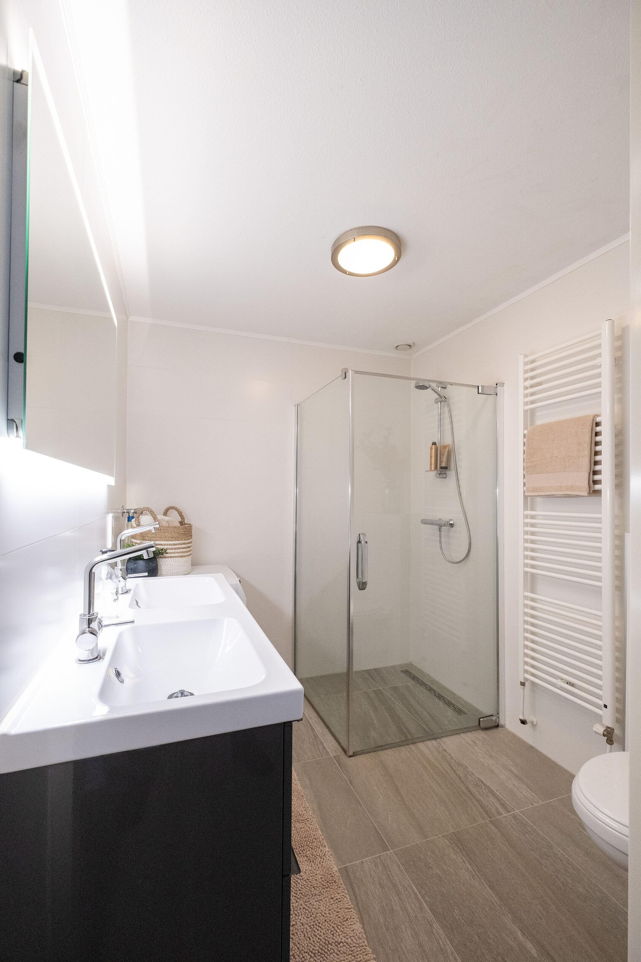 - Douche, dubbele wastafel, en toilet