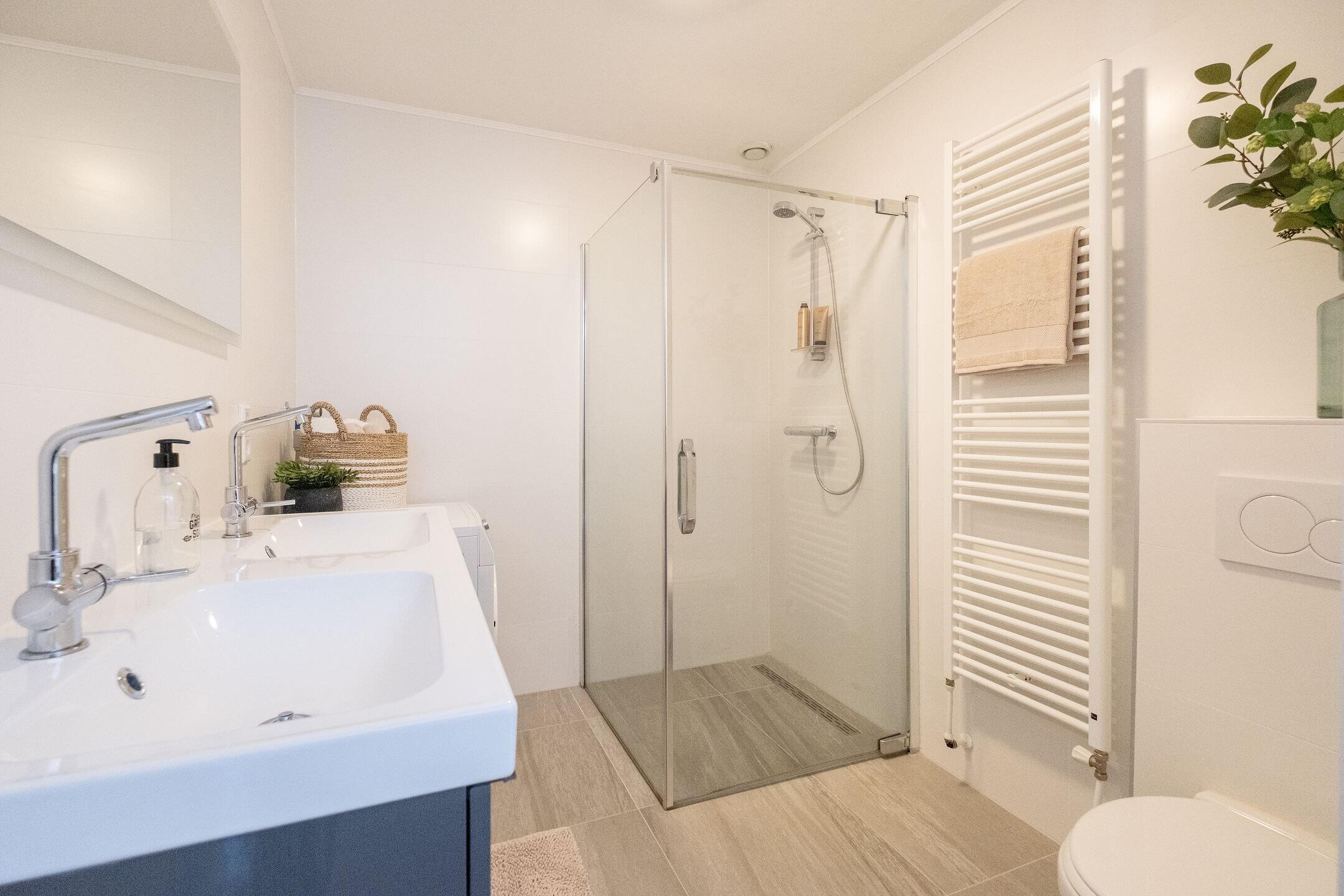 - Moderne badkamer (ca. 2017) met douche, hangend toilet, dubbele wastafel en designradiator