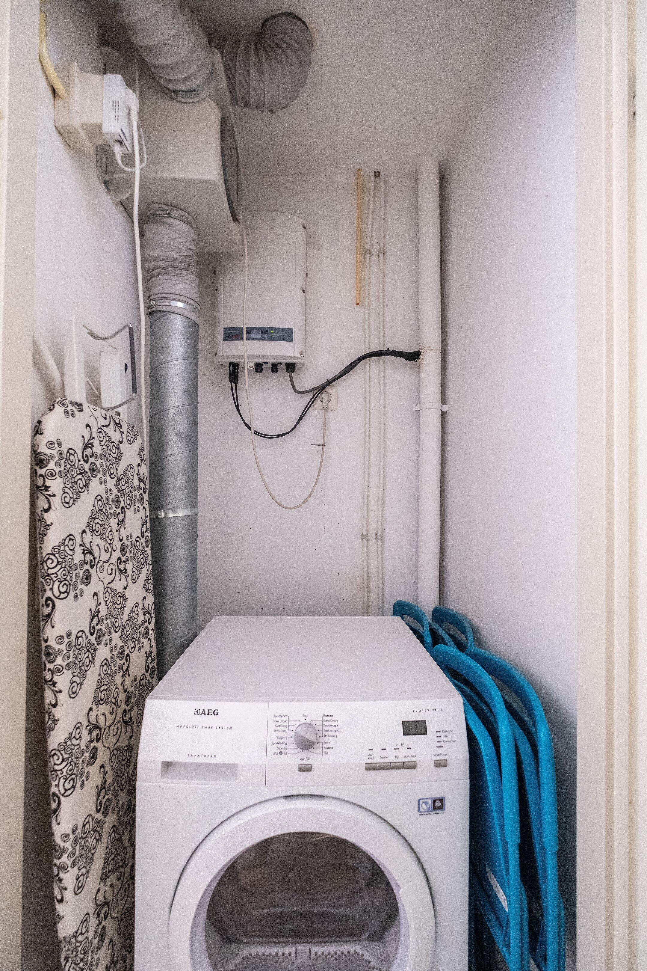 Op de eerste verdieping bevinden zich twee slaapkamers, beide afgewerkt met vloerbedekking en lichte wanden. Op de overloop vind je een handige inloopkast en een aparte kast met de aansluitingen voor wasmachine, droger, de omvormer van de zonnepanelen en de mechanische ventilatie-unit.