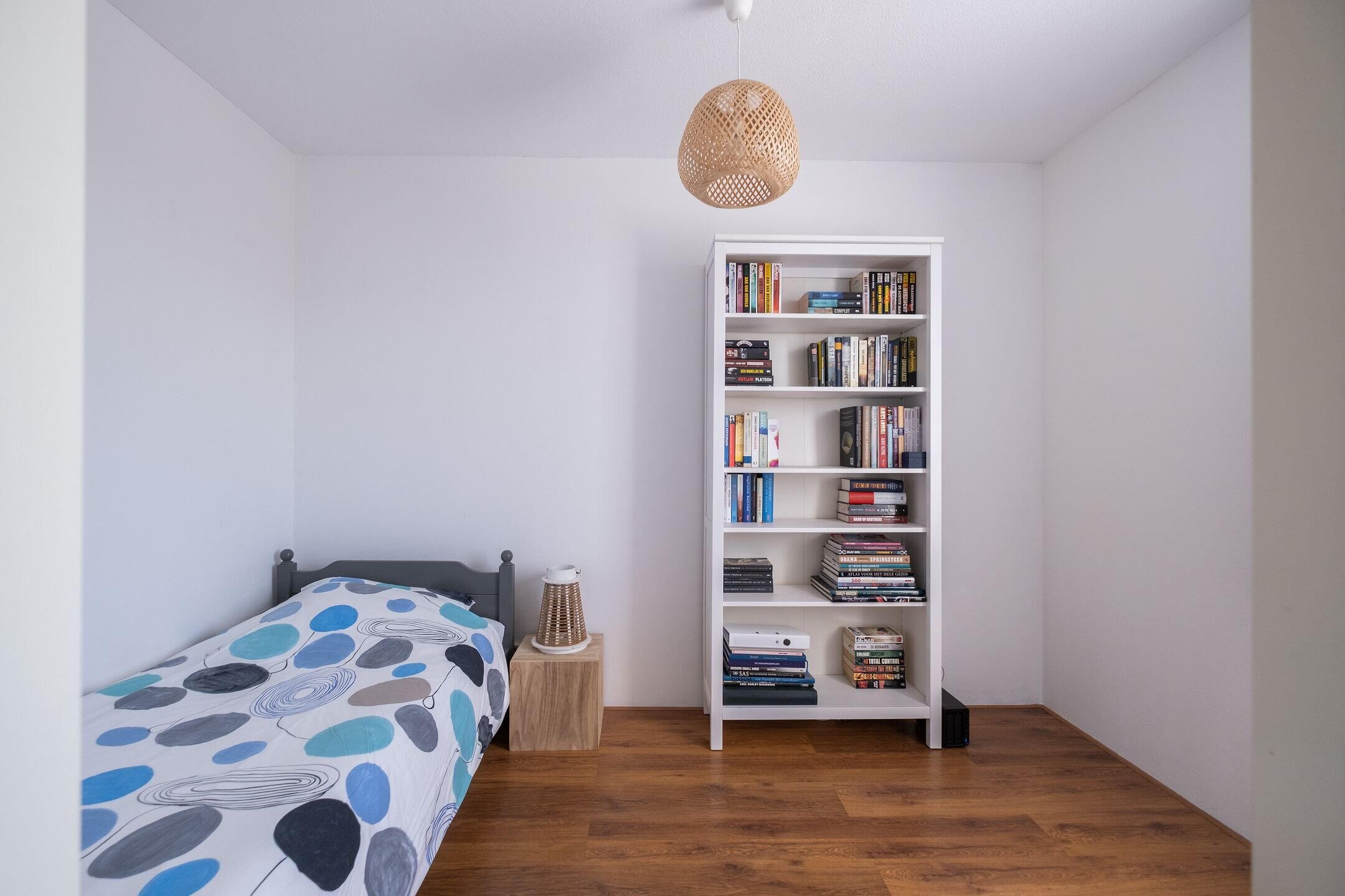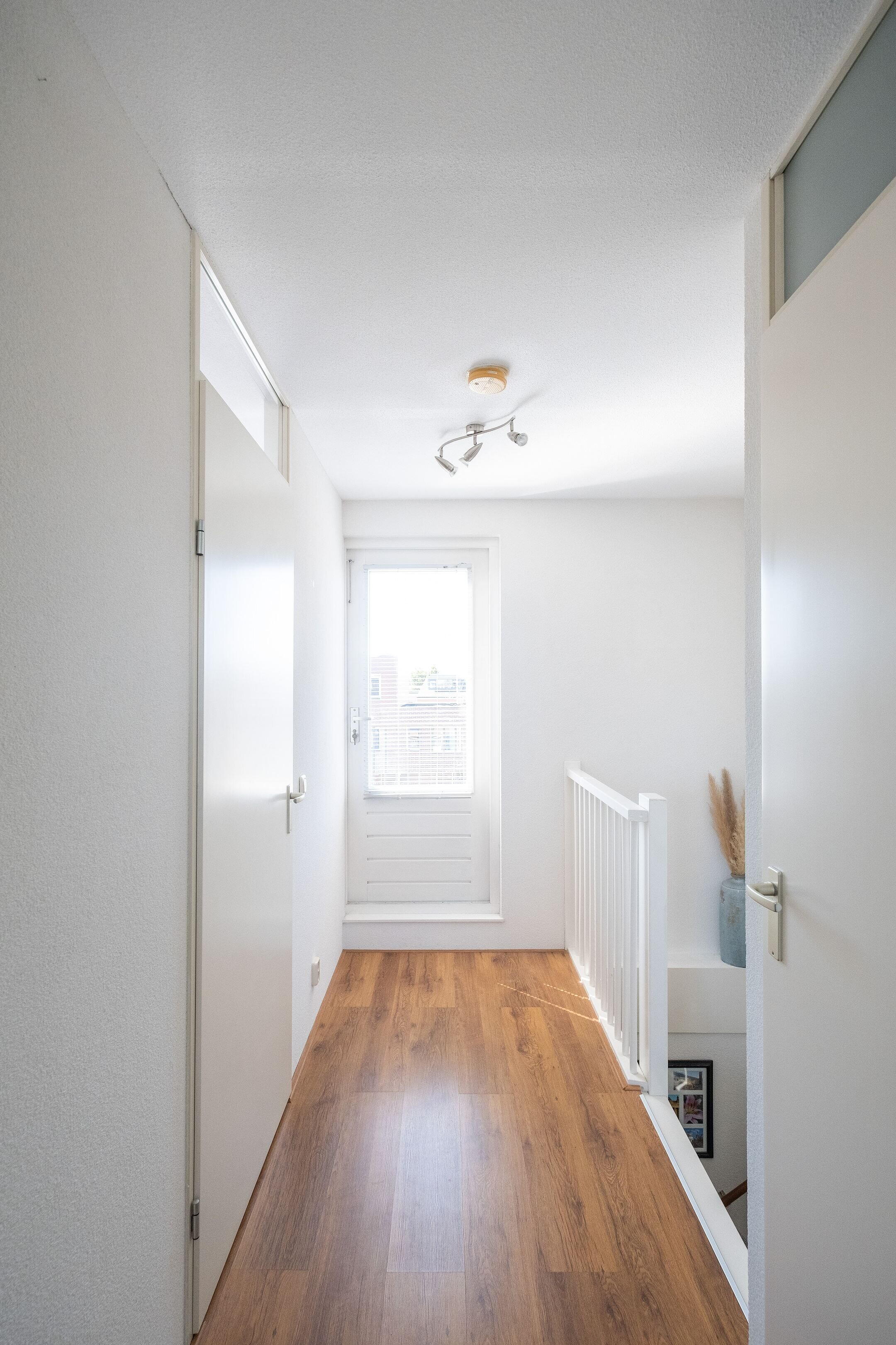 De tweede verdieping telt twee slaapkamers, waarvan de voorste is afgewerkt met laminaat en licht afgewerkte wanden en de achterste met vloerbedekking. Op de overloop is een extra voorraadkast aanwezig.
