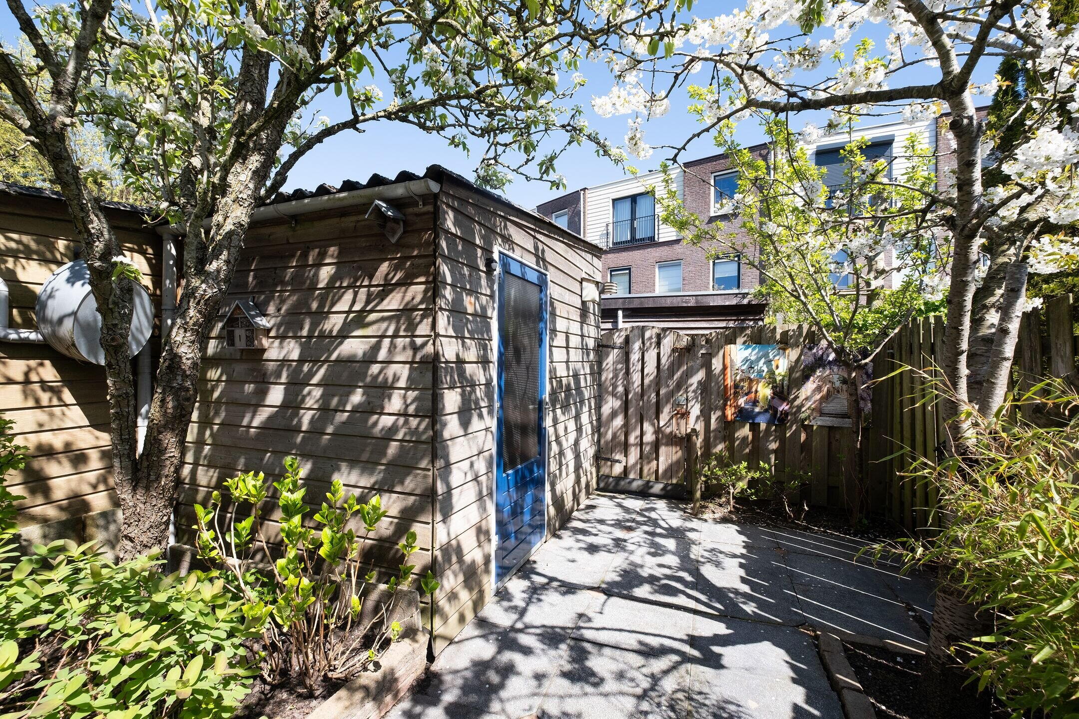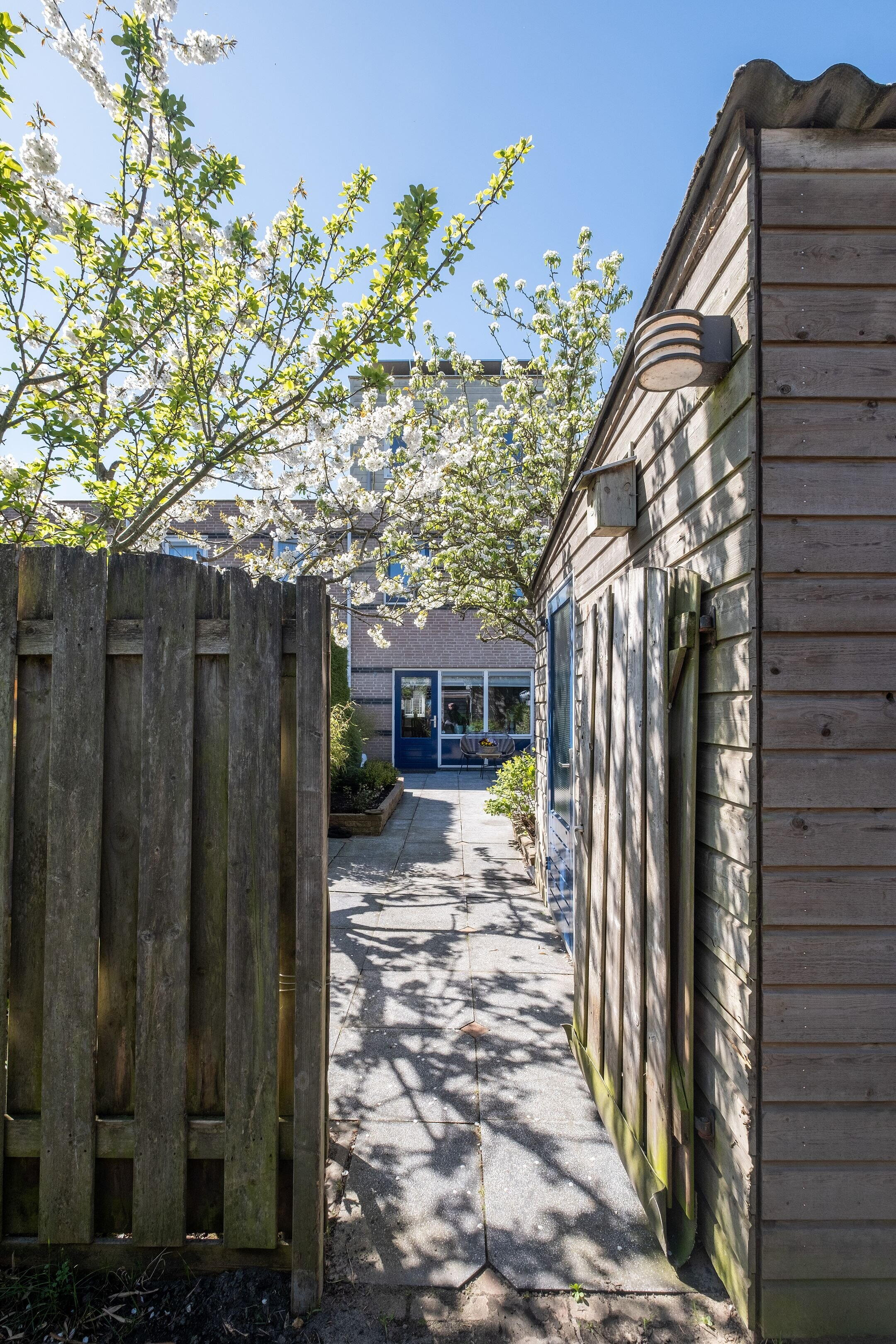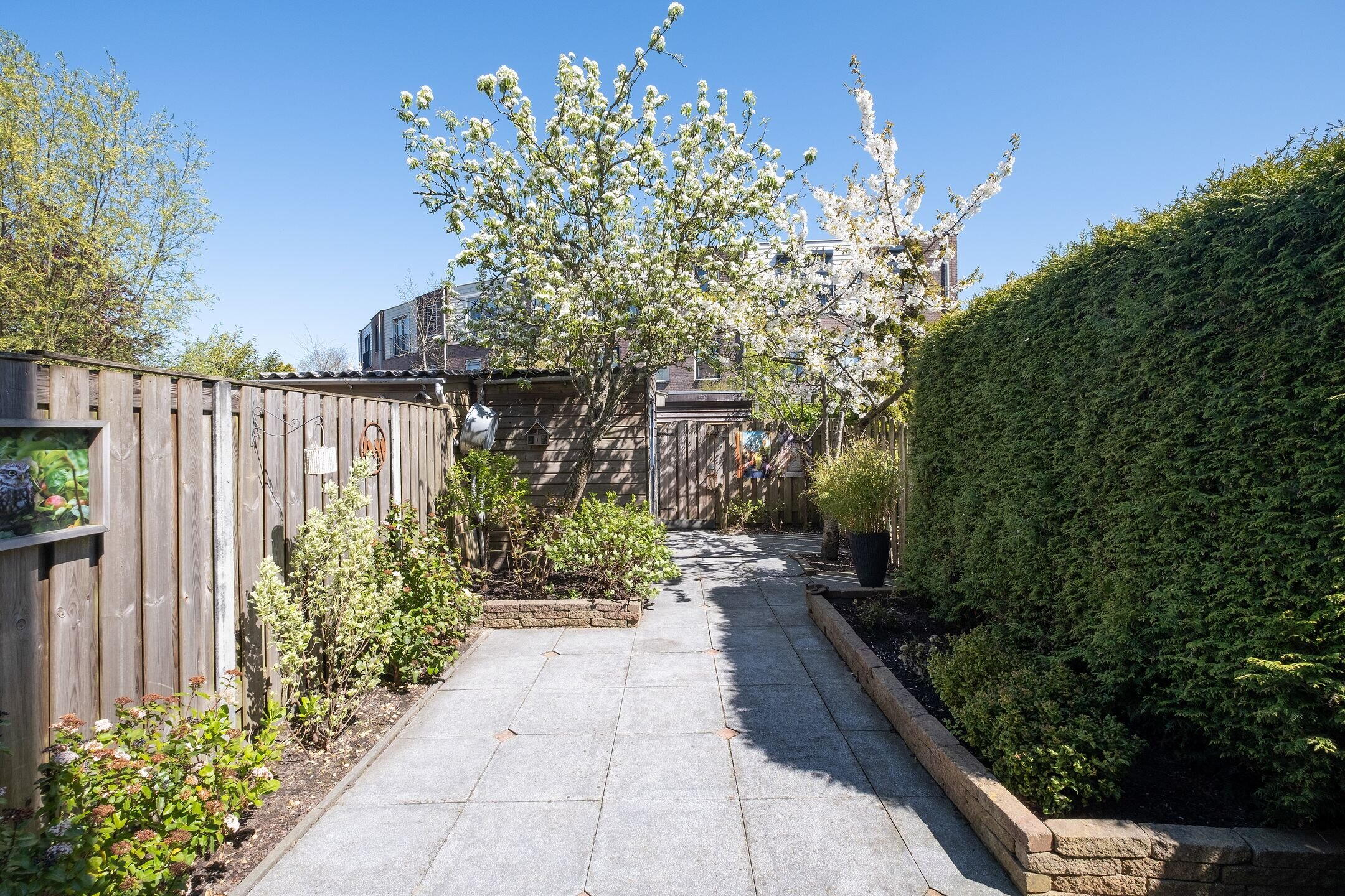 De achtertuin meet ca. 4,90 x 11,50 meter en is voorzien van een achterom via de steeg. Achterin staat een vrijstaande houten berging voorzien van elektriciteit. De voortuin is netjes aangelegd en geeft de woning een verzorgde uitstraling.