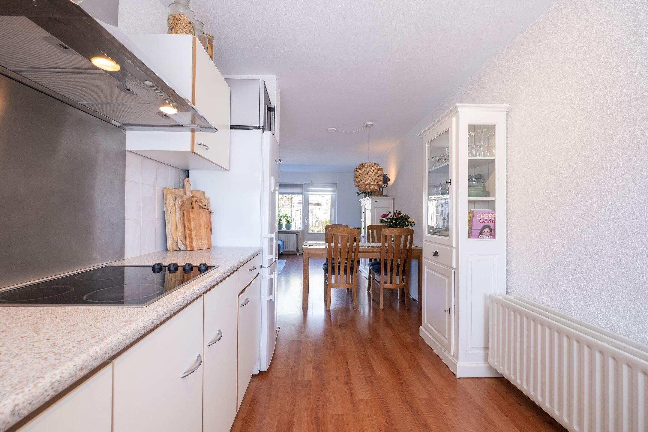 De semi-open keuken kijkt uit op de straat en is voorzien van een 4-zones keramische kookplaat, losse koel-vriescombinatie, vaatwasser (Bosch, 2017) en afzuigkap.